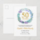 This Save the Date Announcement Postcard for the 50th wedding anniversary features a delicate floral greenery wreath made of bluebells, plants, and lilac flowers. It can be easily personalized with your special golden vow renewal information.