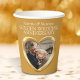 Personalise these golden effect heart wedding anniversary party paper cups with your own 50th wedding anniversary couples names, photo, date and years of marriage. Other matching items are available. Liquid golden heart effect graphic art and design by Sarah Trett for www.mylittleeden.com and www.mylittleedenweddings.com