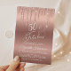 Elegant and chic fiftieth birthday party invitation featuring "50 & Fabulous" in a pretty stylish script against a rose gold background, with rose gold faux glitter dripping from the top. You can personalize with her name and the party details.