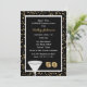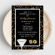 This great Surprise 50th birthday party invitation features gold confetti on black in the background with a glass and the number "50" making for a great modern adult surprise invitation to a 50th birthday party for men. Copyright henishouseofpaper