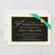 Create your own personalised 50th Wedding Anniversary Party Invitations -- Ivory and black with [printed] aqua ribbon and golden gemstone heart. Classic engraved-look typography with fancy vintage style swash script gold lettering -- Elegant, affordable luxury, and uniquely customised for you! Just add the names, date, and details for your special milestone anniversary celebration. **NOTE: All elements of this design are part of the PRINTED image -- the ribbon, jewelled brooch, and frame are NOT raised, embossed, or presented as real embellishments. Sized for small invitation cards. Click "Customise It" to change the size, paper options, or font choices. Other sizes and styles available in gallery. © Teri Francis. Coordinating sets with matching postage and thank you cards available upon request.