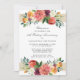 Elegant wedding anniversary party invitation features stylish custom text framed by a rustic floral design of fall watercolor flowers, including roses, dahlias, peony flowers, and greenery, in a gorgeous autumn palette of burgundy red, golden yellow, peach orange, blush pink, and shades of green. Accented with wide neutral beige stripes.