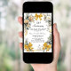A white background. Decorated with white and yellow florals, golden ribbons and bows. Personalise and add a name and details.
