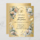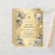 A faux gold looking background. Decorated with white and yellow florals and a golden ribbon. Personalise and add your names and details.