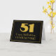 This vintage appearance and 1920s/1930s era style inspired birthday-themed greeting card design features a large art deco style inspired number "51", the message "Happy 51st Birthday,", a personalised name, and a border pattern consisting of thin lines on the front. The background of the front is coloured black. The inside has a custom birthday greeting message, or could perhaps be cleared and left blank if a message is to be written by hand instead. A customised birthday greeting card like this might be used to acknowledge somebody’s fifty-first birthday. [~Z0000498]