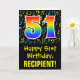 The front of this fun, vibrant, and colorful birthday greeting card design features a large number "51" having a rainbow spectrum gradient inspired pattern. It also features the message "Happy 51st Birthday,", and an editable recipient name. The front also features a colorful music notes and symbols pattern. The inside features a customized birthday greeting message, or could perhaps be cleared and left blank if a message is to be written by hand instead. A personalized birthday card like this might be a fun way to celebrate somebody’s fifty first birthday. [~Z0000420]