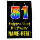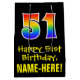 This colourful, fun, and exciting birthday-themed gift bag design features a large number "51" with a rainbow spectrum gradient style pattern, along with the message "Happy 51st Birthday,", and a custom recipient name. The background is coloured black. A birthday themed gift bag like this might be a fun way to wrap a gift or present being given to celebrate somebody’s 51st birthday. [~Z0000512]