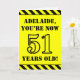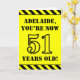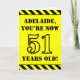 The front of this bold and fun birthday-themed greeting card design features a custom name and the message "YOU’RE NOW 51 YEARS OLD!" in black stencil style text on a yellow coloured background. There is also an eye-catching black and yellow stripes pattern at the top and bottom edges of the front. The inside features a customisable birthday greeting message, or could perhaps be cleared and left blank if a message is to be written by hand instead. A personalised birthday card like this might be a fun way to send birthday wishes to somebody who is celebrating their fifty first birthday. [~Z0000413]