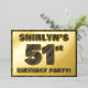 The front of this bold fifty-first birthday celebration/party foil invitation card features a personalised name, a large number “51st”, the message “BIRTHDAY PARTY!”, and a border, all featuring a rustic, yet sophisticated, faux wood grain appearance inspired pattern. The back features personalised details about the event, such as the date, time, venue, and any other important information. Customised invitations like these might be used to invite guests/attendees to a birthday party being held to celebrate somebody’s 51st birthday. [~Z0000595]