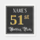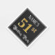 This elegant and opulent birthday paper napkin design features a personalized name and the message “51st Birthday Party”. The large number “51st” has a faux/imitation gold-inspired coloring pattern, and the words “Birthday Party” are in ornate script-style text. The background is colored black by default (although it can be customized). Fancy, luxurious paper napkins like this might be used at a birthday celebration/party being held to honor somebody’s 51st birthday. [~Z0000565]