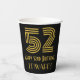 This Roaring Twenties inspired and vintage appearance birthday paper cup design features a large art deco inspired appearance number “52”, in addition to the birthday greeting message “Happy 52nd Birthday,” and an editable name. The background is coloured black. Roaring Twenties inspired paper cups like this might be used when hosting a birthday party for somebody in celebration of their 52nd birthday. [~Z0000546]