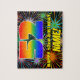 This exciting and eye-catching birthday themed jigsaw puzzle design features a large number “52” having a multicolored rainbow spectrum inspired gradient pattern. It also features the message “HAPPY 52nd BIRTHDAY,”, and a customisable recipient name. The background has a colourful, multicolored pattern inspired by bursting celebratory fireworks. An upbeat, customisable birthday puzzle like this might be a fun way to send some birthday wishes to somebody who is celebrating their fifty-second birthday. [~Z0000605]