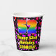 This happy and colorful birthday paper cup design features a large number “52” with a rainbow spectrum gradient inspired pattern, along with the message “Happy 52nd Birthday,”, and an editable name. The background features a pattern of heart shapes with colors like purple, red, and pink. Friendly, loving paper cups like this might be fun to use at a birthday celebration/party being held to honor somebody’s fifty second birthday. [~Z0000548]