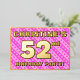 The front of this upbeat and loving fifty-second birthday party/celebration foil invitation card design features a personalised name, a large number “52nd”, the message “BIRTHDAY PARTY!”, and a border. The background of the front has a fun pattern with light pink and dark pink stripes and heart shapes. The back features personalised details about the event, such as the date, time, location/venue, and any other information that may be useful. Customised invitations like these might be a fun way to invite guests to a birthday party being held in celebration of somebody’s 52nd birthday. [~Z0000603]