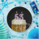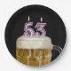 Lit birthday candles in mug of beer on black for 53rd birthday.