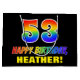 This fun, cheerful, and colourful birthday gift bag design features a large number "53" and the message "HAPPY BIRTHDAY,", both having a rainbow spectrum gradient inspired pattern colouring, along with a bold yellow editable recipient name. The background is coloured black. A fun birthday themed gift bag like this might be used when giving a gift or present in celebration of somebody’s 53rd birthday. [~Z0000477]