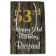This elegant, stylish, and luxurious birthday themed giftbag design features a large ordinal number “53rd” having a faux/imitation gold-inspired look, plus the birthday greeting message “Happy 53rd Birthday,” and an editable recipient name in a script-style font. It also has a faux wood-inspired background pattern. A sophisticated birthday themed gift bag like this might be a fun way to wrap a gift or present being given to celebrate somebody’s 53rd birthday. [~Z0000520]