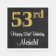 This stylish, sophisticated, and luxurious birthday themed paper napkin design features a large ordinal number “53rd” having an imitation/faux gold-inspired appearance, along with the birthday greeting message “Happy 53rd Birthday,” and a custom name in a script-style font. The background is coloured black. Paper napkins like this might be used when celebrating somebody’s fifty third birthday. [~Z0000516]