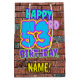 The front of this fun birthday-themed gift bag design features the message “HAPPY 53RD BIRTHDAY,” having a vibrant, colourful, graffiti-inspired appearance, along with a personalised recipient name. The background features a brick wall inspired pattern. A vibrant birthday themed gift-bag like this might be a fun way to wrap a gift or present being given to somebody who is celebrating their 53rd birthday. [~Z0000536]