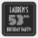This luxurious fifty-third birthday party square sticker design features a personalised name, a fancy art deco style inspired number “53rd”, the message “BIRTHDAY PARTY!”, and a multi-line border. It features a black-coloured background by default, but it can be customised to a different colour, if desired. Stickers like these might be used when celebrating somebody’s 53rd birthday. [~Z0000617]