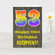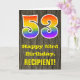 The front of this colourful yet rustic birthday greeting card design features a large number "53" with a rainbow spectrum gradient inspired pattern, along with the message "Happy 53rd Birthday,", and a customisable recipient name. The front features a background depicting a rustic faux wood grain look pattern. The inside features a customisable birthday greeting message, or could perhaps be cleared and left blank if a message is to be written by hand instead. A customisable birthday card like this might be a fun way to celebrate somebody’s fifty third birthday. [~Z0000419]