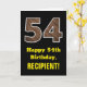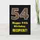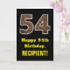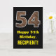 This rustic, fun birthday themed greeting card design features a large number "54" having an imitation wood grain inspired appearance pattern on the front. The front also features the birthday greeting message "Happy 54th Birthday,", and a personalized recipient name. The inside features a custom birthday greeting message, or could perhaps be cleared and left blank if a message is to be written by hand instead. A custom birthday card like this might be a fun way to send birthday wishes to somebody who is celebrating their fifty fourth birthday. [~Z0000433]