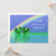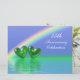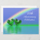 55th emerald anniversary invitation with a rainbow in a blue sky and two shiny emerald green hearts floating on the water. Customise the sample text on the back with your own information for your event.