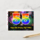 The front of this fun, exciting, and colorful birthday postcard design features a large number "55" having a rainbow spectrum gradient inspired pattern. It also features the message "Happy 55th Birthday,", and an editable recipient name. The front additionally features a colorful and vibrant background pattern inspired by bursting celebratory fireworks. The back features a customizable birthday greeting message, or could perhaps be cleared and left blank if a message is to be written by hand instead. A personalized birthday postcard like this might be a fun way to send a message in celebration of somebody’s fifty fifth birthday. Postcards like this might also be used to invite guests to a birthday party being held for somebody who is turning 55 years old. [~Z0000446]