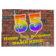 This colourful and vibrant birthday themed gift bag design, inspired by graffiti, features a large number "55" having a rainbow spectrum gradient inspired pattern. It also features the message "Happy 55th Birthday,", and a custom name. It also has a brick wall style pattern background. A gift bag like this might be used when giving a gift or present in honour of somebody’s fifty fifth birthday. [~Z0000522]