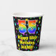 This fun and cheerful birthday paper cup design features a large number “55” having a rainbow spectrum gradient inspired pattern. It also features the message “Happy 55th Birthday,”, and a personalised name. The background features a colourful pattern inspired by a field of stars. Colourful, vibrant paper cups like this might be fun to use at a birthday celebration/party being held in celebration of somebody’s 55th birthday. [~Z0000540]