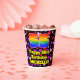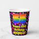 This cheerful and joyful birthday-themed paper cup design features a large number “55” having a rainbow spectrum gradient inspired pattern. It also features the message “Happy 55th Birthday,”, and a personalized name. The background features a pattern of purple, red, and pink heart shapes. Friendly, joyful paper cups like this might be fun to have at a birthday party being held to honor somebody’s fifty fifth birthday. [~Z0000548]