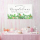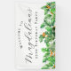 Elegant winter watercolor green holly sprigs create a beautiful holiday greenery border at the bottom of this birthday party welcome banner, green holly is the December birth flower. A trendy font combination gives it a modern vibe. All of the text is editable.