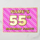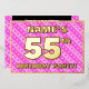 The front of this joyful fifty-fifth birthday celebration foil invitation card design features a customisable name, a large number “55th”, the message “BIRTHDAY PARTY!”, and a border. The background of the front has an upbeat dark pink and light pink striped pattern containing heart shapes. The back features personalised details about the event, such as the date, time, venue/location, and any other important information. Customised invitations like these might be a fun way to invite attendees to a birthday gathering/party being held to honour somebody’s 55th birthday. [~Z0000603]