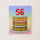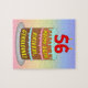 This colourful and cheerful birthday themed jigsaw puzzle design features a cartoon-style depiction of a three-tier birthday cake having number-shaped candles on top showing the age “56“, along with the message “HAPPY 56TH BIRTHDAY,”, and an editable recipient name. The background features a multicolored pastel rainbow spectrum inspired gradient pattern. A fun, personalised birthday puzzle like this might be given in celebration of somebody’s fifty-sixth birthday. [~Z0000621]