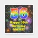 This cheerful and fun birthday themed paper napkin design features a large number “56” with a colourful rainbow spectrum gradient inspired pattern, along with the message “Happy 56th Birthday,”, and a custom name. The background features a multicolored pattern inspired by the appearance of bursting celebratory fireworks. Paper napkins like this might be use at a birthday party for somebody who is celebrating their fifty sixth birthday. [~Z0000574]