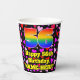 This cheerful and colorful birthday themed paper cup design features a large number “56” having a rainbow spectrum gradient inspired pattern. It also features the message “Happy 56th Birthday,”, and a customizable name. The background features a pattern of pink, purple, and red heart shapes. Loving, joyful paper cups like this might be fun to use at a birthday party being held to celebrate somebody’s fifty sixth birthday. [~Z0000548]