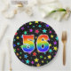 This colourful, fun, and cheerful paper plate design features a large number "56" containing a rainbow spectrum gradient inspired pattern. The background features a colourful star shapes pattern. Fun paper plates like this might be used at a party being held to celebrate somebody’s 56th birthday, or a couple’s 56th anniversary, or some other 56th event. [~Z0000493]