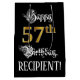 This opulent and luxurious birthday-themed giftbag design features the message “Happy 57th Birthday,”, along with an editable recipient name. Part of the message is in an elegant script-style text. The large number “57th” features a faux/imitation gold-inspired look pattern. The background is colored black. A gift-bag like this might be used when wrapping gifts being given to somebody in celebration of their fifty seventh birthday. [~Z0000560]