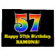This vibrant and fun birthday-themed gift bag design features a large number "57" having a rainbow spectrum gradient inspired pattern. It also features the message "Happy 57th Birthday,", and a custom name. It also has a black-coloured background. A gift-bag like this might be used when wrapping gifts being given to somebody in celebration of their 57th birthday. [~Z0000521]