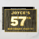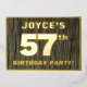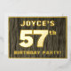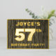 The front of this bold fifty-seventh birthday party/celebration foil invitation card features an editable name, a large number “57th”, the message “BIRTHDAY PARTY!”, and a border, all in foil. The background of the front features a rustic, yet elegant, faux wood grain appearance inspired pattern. The back features personalised details about the event, such as the date, time, venue/place, and any other information that may be important. Customisable invitations like these might be used to invite guests/attendees to a birthday gathering/party being held to celebrate somebody’s 57th birthday. [~Z0000598]