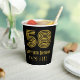 This vintage style and Roaring Twenties inspired birthday-themed paper cup design features a large art deco inspired look number “58”, in addition to the birthday greeting message “Happy 58th Birthday,” and a custom name. The background is coloured black. Birthday themed paper cups like this might be fun to use at a party being held for somebody who is celebrating their 58th birthday. [~Z0000546]