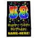This exciting, colourful, and fun birthday themed gift bag design features a large number "58" with a rainbow spectrum gradient inspired pattern, along with the message "Happy 58th Birthday,", and a personalised recipient name. It also has a colourful background pattern featuring variously-sized star shapes. A fun gift bag like this might be used when wrapping presents being given to somebody in celebration of their 58th birthday. [~Z0000510]