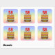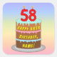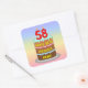 This joyful and fun birthday themed square sticker design features a cartoon-style depiction of a three-tier birthday cake having number-shaped candles on top showing the age “58“, along with the message “HAPPY 58TH BIRTHDAY,”, and a custom recipient name. The background features a multicolored pastel rainbow spectrum inspired gradient pattern. Stickers like these might be distributed or used at a party held in celebration of somebody’s 58th birthday, or perhaps used when wrapping gifts or preparing invitations for such an event. [~Z0000624]