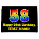 This colourful and fun birthday gift bag design features a large number "58" having a rainbow spectrum gradient inspired pattern. It also features the message "Happy 58th Birthday,", and an editable name. It also has a black-coloured background. A giftbag like this might be used when wrapping gifts being given to somebody in celebration of their 58th birthday. [~Z0000521]