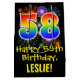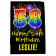 This exciting, colourful, and fun birthday themed gift bag design features a large number "58" with a rainbow spectrum gradient inspired pattern, along with the message "Happy 58th Birthday,", and an editable recipient name. It also features a colourful background pattern inspired by the appearance of bursting celebratory fireworks. A gift bag like this might be a fun way of wrapping a birthday present or gift being given to somebody who is celebrating their 58th birthday. [~Z0000509]