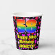 This cheerful and fun birthday-themed paper cup design features a large number “58” having a rainbow spectrum gradient inspired pattern. It also features the message “Happy 58th Birthday,”, and a customizable name. The background features a pattern of pink, purple, and red heart shapes of various sizes. Friendly, cheerful paper cups like this might be fun to have at a birthday celebration/party being held to celebrate somebody’s fifty eighth birthday. [~Z0000548]