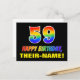 The front of this fun, colourful, and cheerful birthday-themed postcard design features a large number "59" and the message "HAPPY BIRTHDAY,", both having a rainbow spectrum gradient inspired pattern colouring, along with a bold yellow custom recipient name. The front also features a minimalist black coloured background. The back of the postcard has an editable birthday greeting message, or could perhaps be cleared and left blank if a message is to be written by hand instead. An exciting customisable birthday postcard like this might be a fun way of acknowledging somebody’s fifty ninth birthday. [~Z0000474]