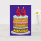The front of this joyful and fun birthday-themed greeting card design features a depiction of a three-tier birthday cake having numeral-shaped candles on top showing the number “59“, along with the message “HAPPY 59TH BIRTHDAY,”, and a custom recipient name. The inside features a customisable birthday greeting message, or could perhaps be cleared and left blank if a message is to be written by hand instead. An upbeat, customisable birthday greeting card like this might be used to celebrate somebody’s fifty-ninth birthday. [~Z0000620]