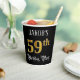 This elegant and fancy birthday themed paper cup design features a customisable name and the message “59th Birthday Party”. The large number “59th” has a faux/imitation gold-inspired colouring pattern, the words “Birthday Party” are in ornate script-style text, and the background is coloured black by default (although it can be customised). Ornate, luxurious paper cups like this might be useful to have at a birthday party being held to honour somebody’s 59th birthday. [~Z0000567]