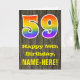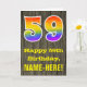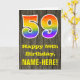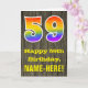 The front of this colourful yet rustic birthday greeting card design features a large number "59" with a rainbow spectrum gradient inspired pattern, along with the message "Happy 59th Birthday,", and an editable recipient name. The background of the front of the card features a rustic faux wood grain appearance pattern. The inside features a custom birthday greeting message, or could perhaps be cleared and left blank if a message is to be written by hand instead. A personalised birthday card like this might be a fun way to celebrate somebody’s fifty ninth birthday. [~Z0000419]
